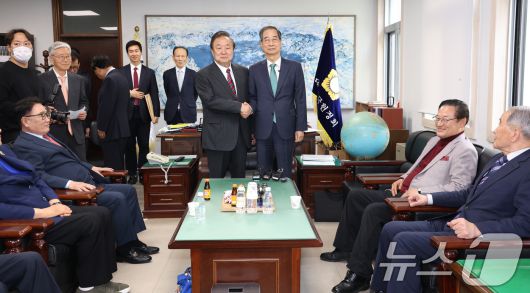 (서울=뉴스1) 오대일 기자 = 한덕수 무소속 대선 예비후보가 3일 오후 서울 영등포구 헌정회에서 정대철 헌정회장을 예방하며 기념촬영을 하고 있다. 2025.5.3/뉴스1