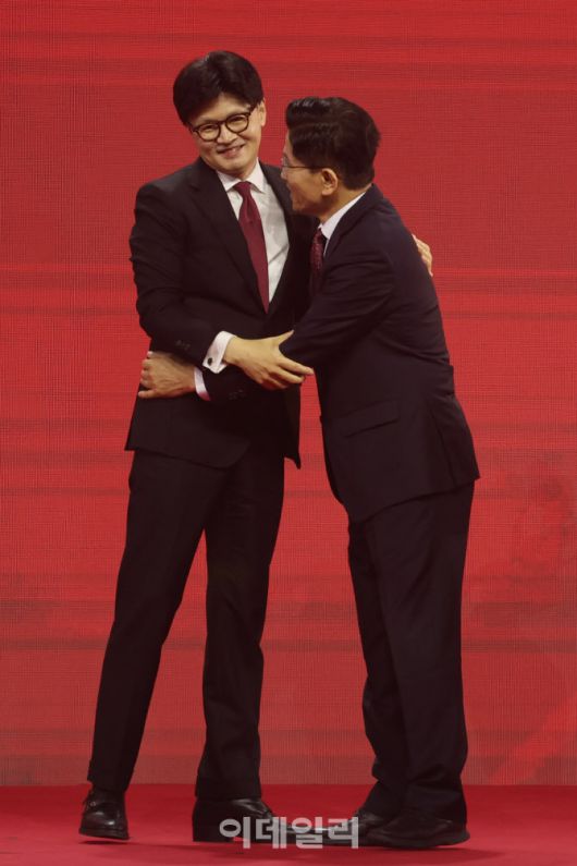 [이데일리 이영훈 기자] 한동훈·김문수 국민의힘 대선 경선 후보가 3일 경기 고양시 킨텍스에서 열린 국민의힘 최종 대선 후보 선출을 위한 전당대회에서 포옹하고 있다.