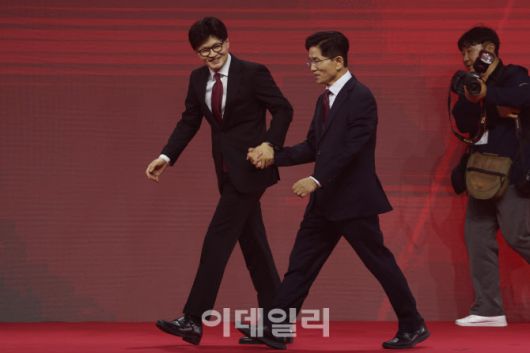 [이데일리 이영훈 기자] 한동훈·김문수 국민의힘 대선 경선 후보가 3일 경기 고양시 킨텍스에서 열린 국민의힘 최종 대선 후보 선출을 위한 전당대회에서 손 잡고 이동하고 있다.