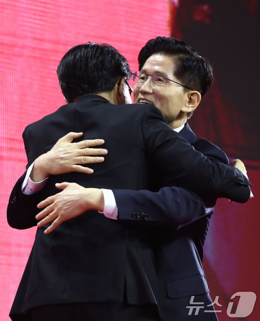 (고양=뉴스1) 김민지 기자 = 국민의힘 김문수, 한동훈 대선 경선 후보가 3일 경기 고양시 킨텍스에서 열린 5차 전당대회에서 포옹하고 있다. 2025.5.3/뉴스1kimkim@news1.krCopyright ⓒ 뉴스1. All rights reserved. 무단 전재 및 재배포, AI학습 이용 금지.