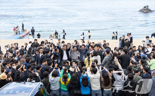 (강릉=뉴스1) 이재명 기자 = '골목골목 경청투어 : 동해안벨트편'에 나선 이재명 더불어민주당 대통령 후보가 3일 오후 강원 강릉시 안목해변에서 시민들을 향해 손을 들어보이고 있다. 2025.5.3/뉴스1