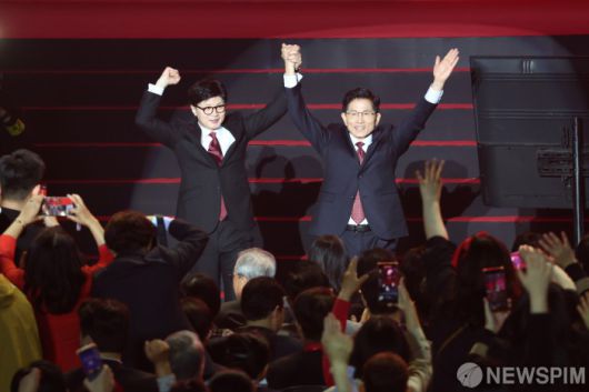 [고양=뉴스핌] 최지환 기자 = 김문수, 한동훈 국민의힘 경선 후보가 3일 오후 경기 고양 킨텍스에서 열린 국민의힘 제5차 전당대회에서 당원들에게 인사하고 있다. 2025.05.03 choipix16@newspim.com |