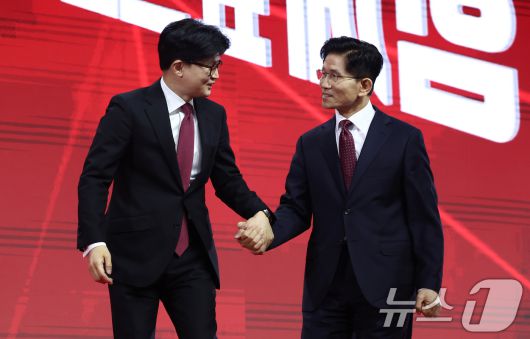 (고양=뉴스1) 김민지 기자 = 국민의힘 김문수, 한동훈 대선 경선 후보가 3일 경기 고양시 킨텍스에서 열린 5차 전당대회에서 기념촬영을 마치고 함께 단상을 내려오고 있다. 2025.5.3/뉴스1kimkim@news1.krCopyright ⓒ 뉴스1. All rights reserved. 무단 전재 및 재배포, AI학습 이용 금지.