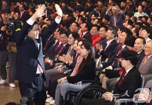 (고양=뉴스1) 김민지 기자 = 김문수 국민의힘 대선 경선 후보가 3일 경기 고양시 킨텍스에서 열린 5차 전당대회에서 입장하며 손을 흔들고 있다. 앞줄 오른쪽은 한동훈 후보. 2025.5.3/뉴스1kimkim@news1.krCopyright ⓒ 뉴스1. All rights reserved. 무단 전재 및 재배포, AI학습 이용 금지.
