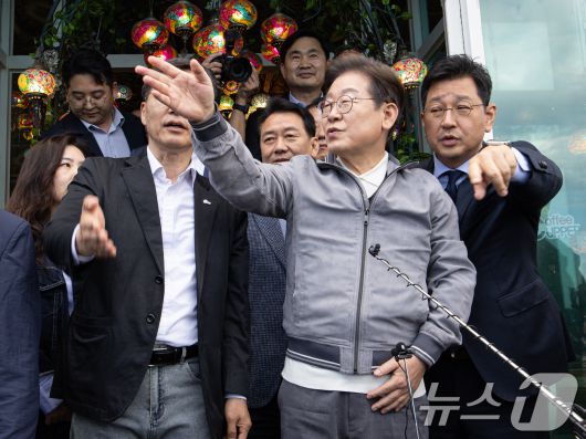 (강릉=뉴스1) 이재명 기자 = '골목골목 경청투어 : 동해안벨트편'에 나선 이재명 더불어민주당 대통령 후보가 3일 오후 강원 강릉시 강릉카페거리에서 관계자들과 대화를 하고 있다. 2025.5.3/뉴스12expulsion@news1.krCopyright ⓒ 뉴스1. All rights reserved. 무단 전재 및 재배포, AI학습 이용 금지.