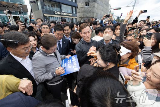 (강릉=뉴스1) 이재명 기자 = '골목골목 경청투어 : 동해안벨트편'에 나선 이재명 더불어민주당 대통령 후보가 3일 오후 강원 강릉시 안목해변에서 한 지지자 요청에 손팻말에 서명하고 있다. 2025.5.3/뉴스12expulsion@news1.krCopyright ⓒ 뉴스1. All rights reserved. 무단 전재 및 재배포, AI학습 이용 금지.