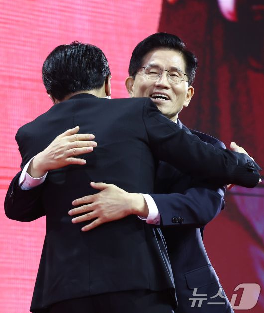 (고양=뉴스1) 김민지 기자 = 국민의힘 김문수, 한동훈 대선 경선 후보가 3일 경기 고양시 킨텍스에서 열린 5차 전당대회에서 포옹하고 있다. 2025.5.3/뉴스1kimkim@news1.krCopyright ⓒ 뉴스1. All rights reserved. 무단 전재 및 재배포, AI학습 이용 금지.