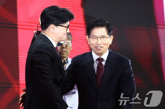 (고양=뉴스1) 김민지 기자 = 국민의힘 김문수(오른쪽), 한동훈 대선 경선 후보가 3일 경기 고양시 킨텍스에서 열린 5차 전당대회에서 기념촬영을 마치고 함께 단상을 내려오고 있다. 2025.5.3/뉴스1