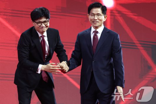 (고양=뉴스1) 김민지 기자 = 국민의힘 김문수(오른쪽), 한동훈 대선 경선 후보가 3일 경기 고양시 킨텍스에서 열린 5차 전당대회에서 기념촬영을 마치고 함께 단상을 내려오고 있다. 2025.5.3/뉴스1kimkim@news1.krCopyright ⓒ 뉴스1. All rights reserved. 무단 전재 및 재배포, AI학습 이용 금지.