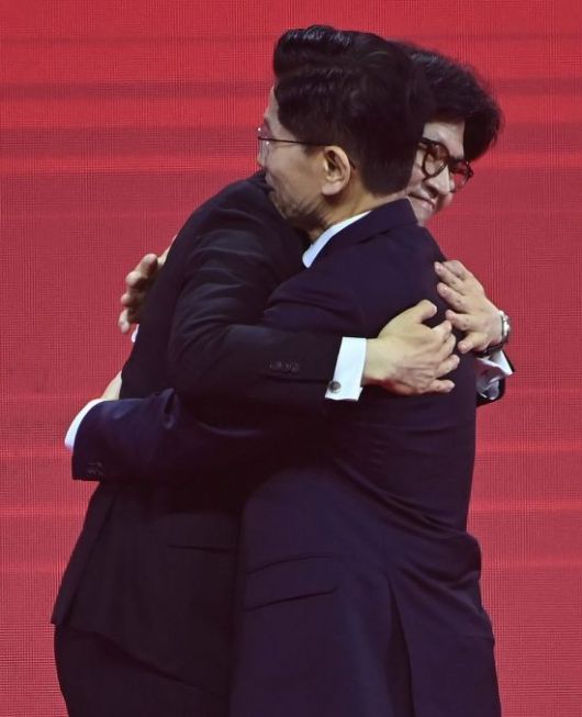 한동훈(왼쪽), 김문수 국민의힘 대선 경선 후보가 3일 경기 고양시 킨텍스에서 열린 5차 전당대회에서 포옹을 하고 있다. <ⓒ투자가를 위한 경제콘텐츠 플랫폼, 아시아경제(www.asiae.co.kr) 무단전재 배포금지>