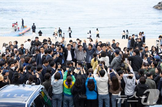 (강릉=뉴스1) 이재명 기자 = '골목골목 경청투어 : 동해안벨트편'에 나선 이재명 더불어민주당 대통령 후보가 3일 오후 강원 강릉시 안목해변에서 관계자들과 손을 들어보이고 있다. 2025.5.3/뉴스12expulsion@news1.krCopyright ⓒ 뉴스1. All rights reserved. 무단 전재 및 재배포, AI학습 이용 금지.