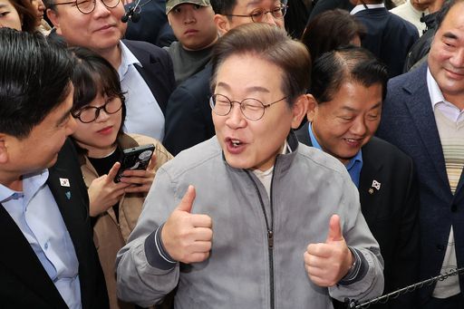 ‘경청 투어’에 나선 더불어민주당 이재명 대선후보가 3일 강원도 속초중앙시장에서 초콜릿을 맛보고 엄지손가락을 치켜 세우고 있다. 뉴시스 |