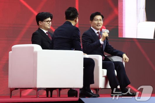 (고양=뉴스1) 김민지 기자 = 국민의힘 김문수(오른쪽), 한동훈 대선 경선 후보가 3일 오후 경기 고양시 킨텍스에서 열린 제5차 전당대회에서 제21대 대통령선거 최종 후보 선출을 위한 개표 결과를 기다리며 토크쇼를 하고 있다. 2025.5.3/뉴스1kimkim@news1.krCopyright ⓒ 뉴스1. All rights reserved. 무단 전재 및 재배포, AI학습 이용 금지.