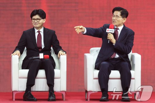 (고양=뉴스1) 이광호 기자 = 김문수 국민의힘 대선 경선 후보가 3일 경기 고양시 킨텍스에서 열린 5차 전당대회 후보자 이벤트 시간에 사회자의 질문에 답하며 아내를 소개하고 있다. 2025.5.3/뉴스1skitsch@news1.krCopyright ⓒ 뉴스1. All rights reserved. 무단 전재 및 재배포, AI학습 이용 금지.