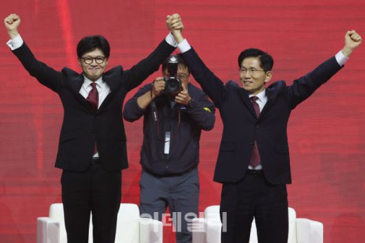 [이데일리 이영훈 기자] 한동훈·김문수 국민의힘 대선 경선 후보가 3일 경기 고양시 킨텍스에서 열린 국민의힘 최종 대선 후보 선출을 위한 전당대회에서 손을 잡고 있다.