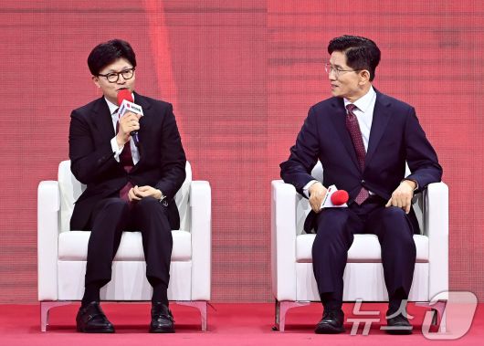 (고양=뉴스1) 이광호 기자 = 한동훈 국민의힘 대선 경선 후보가 3일 오후 경기 고양시 킨텍스에서 열린 제5차 전당대회에서 제21대 대통령선거 최종 후보 선출을 위한 개표 결과를 기다리며 사회자 질문에 답하고 있다. 오른쪽은 김문수 후보. (공동취재) 2025.5.3/뉴스1