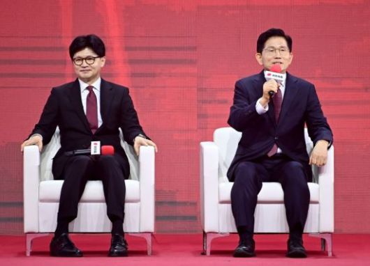 한동훈(왼쪽), 김문수 국민의힘 대선 경선 후보가 3일 경기 고양시 킨텍스에서 열린 5차 전당대회에서 토크 콘서트를 하고 있다. <ⓒ투자가를 위한 경제콘텐츠 플랫폼, 아시아경제(www.asiae.co.kr) 무단전재 배포금지>