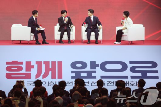 (고양=뉴스1) 이광호 기자 = 한동훈, 김문수 국민의힘 대선 경선 후보가 3일 경기 고양시 킨텍스에서 열린 5차 전당대회 후보자 이벤트 시간에 사회자의 질문에 답하고 있다. 2025.5.3/뉴스1skitsch@news1.krCopyright ⓒ 뉴스1. All rights reserved. 무단 전재 및 재배포, AI학습 이용 금지.