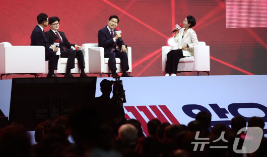 (고양=뉴스1) 김민지 기자 = 국민의힘 김문수, 한동훈 대선 경선 후보가 3일 오후 경기 고양시 킨텍스에서 열린 제5차 전당대회에서 제21대 대통령선거 최종 후보 선출을 위한 개표 결과를 기다리며 사회자의 질문에 답변하고 있다. 2025.5.3/뉴스1kimkim@news1.krCopyright ⓒ 뉴스1. All rights reserved. 무단 전재 및 재배포, AI학습 이용 금지.