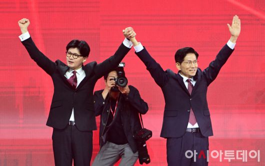 아시아투데이 이병화 기자 = 김문수(오른쪽)-한동훈 국민의힘 대선 경선 후보가 3일 경기 고양시 킨텍스에서 열린 5차 전당대회에서 당원들에게 인사하고 있다.