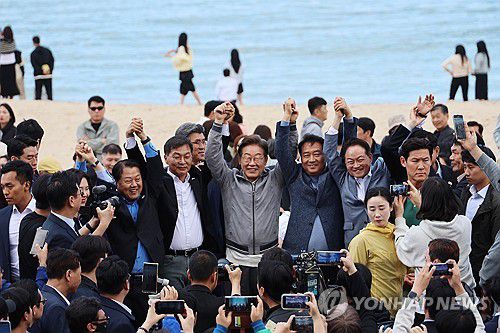 (강릉=연합뉴스) 김주성 기자 = 더불어민주당 이재명 대선 후보가 '골목골목 경청투어' 사흘째인 3일 강원도 동해안 지역의 민심을 공략하기 위해 강릉 안목해변을 찾아 이광재 전 강원지사 등과 함께 도민, 관광객들에게 지지를 호소하고 있다. 2025.5.3 utzza@yna.co.kr