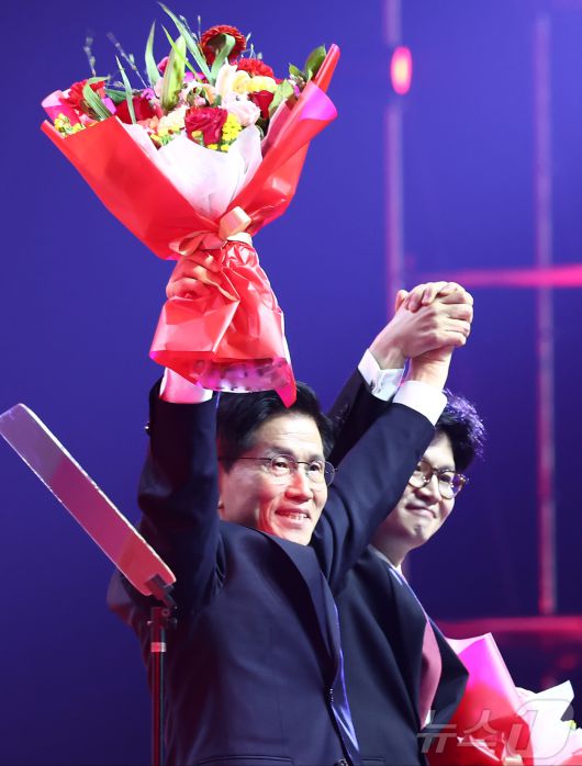 (고양=뉴스1) 김민지 기자 = 김문수 국민의힘 대통령 후보가 3일 경기 고양시 킨텍스에서 열린 5차 전당대회에서 최종 후보로 확정된 뒤 한동훈 대선 경선 후보와 손을 잡고 있다. 2025.5.3/뉴스1photo_desk@news1.krCopyright ⓒ 뉴스1. All rights reserved. 무단 전재 및 재배포, AI학습 이용 금지.