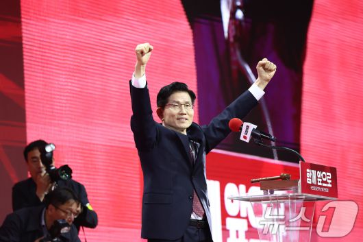 (고양=뉴스1) 김민지 기자 = 김문수 국민의힘 대통령 후보가 3일 경기 고양시 킨텍스에서 열린 5차 전당대회에서 최종 후보로 확정된 뒤 두손을 번쩍 들고 있다. 2025.5.3/뉴스1kimkim@news1.krCopyright ⓒ 뉴스1. All rights reserved. 무단 전재 및 재배포, AI학습 이용 금지.