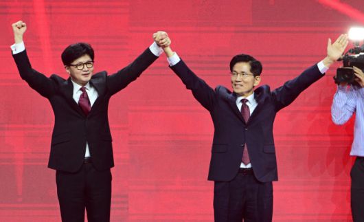 김문수(오른쪽)-한동훈 국민의힘 대선 경선 후보가 3일 경기 고양시 킨텍스에서 열린 5차 전당대회에서 당원들에게 인사하고 있다. /이병화 기자 |