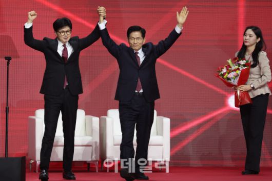 [이데일리 이영훈 기자] 김문수 국민의힘 대선 경선 후보가 3일 경기 고양시 킨텍스에서 열린 국민의힘 최종 대선 후보 선출을 위한 전당대회에서 당선되자 한동훈 후보의 축하를 받고 있다.