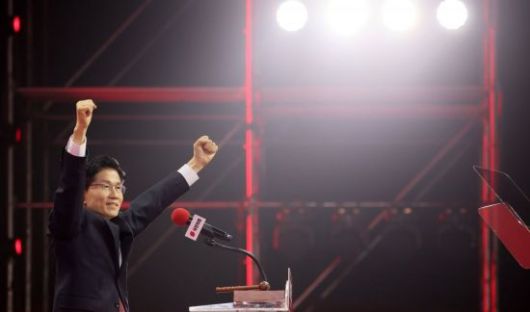 김문수 국민의힘 대통령 후보가 3일 경기 고양시 킨텍스에서 열린 5차 전당대회에서 최종 후보로 확정된 뒤 두 손을 번쩍 들고 있다.