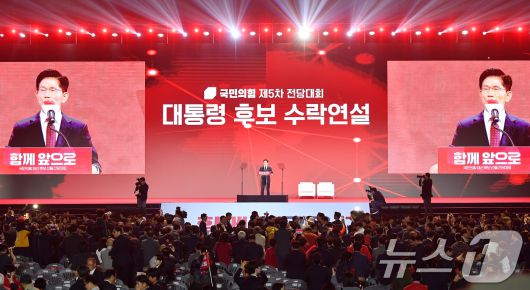 (고양=뉴스1) 이광호 기자 = 김문수 국민의힘 대통령 후보가 3일 경기 고양시 킨텍스에서 열린 5차 전당대회에서 최종 후보로 확정된 뒤 수락 연설을 하고 있다. (공동취재) 2025.5.3/뉴스1