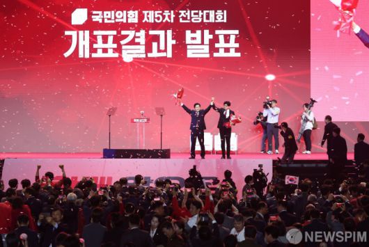 [고양=뉴스핌] 최지환 기자 = 국민의힘 대선후보로 선출된 김문수 후보가 3일 오후 경기 고양시 킨텍스에서 열린 국민의힘 제5차 전당대회에서 한동훈 후보와 함께 기념촬영을 하고 있다. 2025.05.03 choipix16@newspim.com
