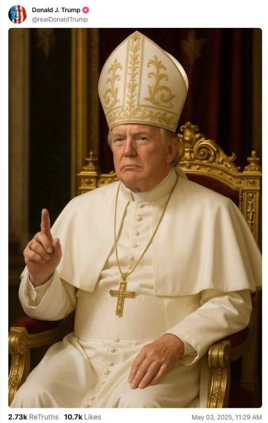 [헤럴드경제=신동윤 기자] 도널드 트럼프 미국 대통령이 교황의 옷을 입은 합성 이미지를 자신의 소셜미디어(SNS)에 게재했다. 차기 교황 선출을 위한 콘클라베를 앞두고 자신이 교황이 되고 싶다는 농담을 던졌던 것에 이어 이 같은 행동을 하며 전 세계인의 이목을 집중시킨 것이다.