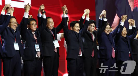 (고양=뉴스1) 김민지 기자 = 김문수 국민의힘 대통령 후보가 3일 경기 고양시 킨텍스에서 열린 5차 전당대회에서 최종 후보로 확정된 뒤 한동훈 대선 경선후보 및 당 지도부와 손을 번쩍 들고 있다. 2025.5.3/뉴스1