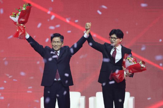 국민의힘 대선 후보로 선출된 김문수 후보가 3일 경기 고양시 킨텍스에서 열린 국민의힘 전당대회에서 꽃다발을 받은 뒤 한동훈 후보와 함께 인사하고 있다. 연합뉴스 |
