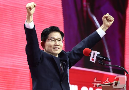 (고양=뉴스1) 김민지 기자 = 김문수 국민의힘 대통령 후보가 3일 경기 고양시 킨텍스에서 열린 5차 전당대회에서 최종 후보로 확정된 뒤 두 손을 번쩍 들어보이고 있다. 2025.5.3/뉴스1kimkim@news1.krCopyright ⓒ 뉴스1. All rights reserved. 무단 전재 및 재배포, AI학습 이용 금지.
