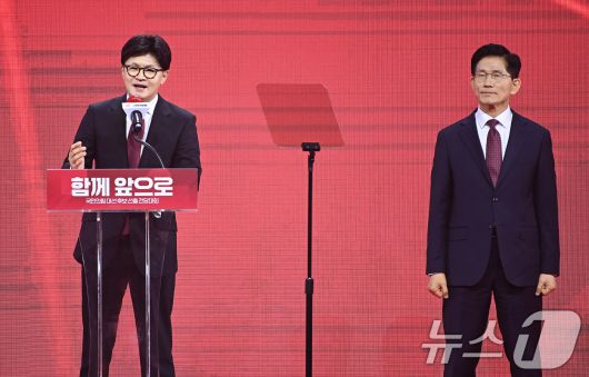 (고양=뉴스1) 이광호 기자 = 한동훈 국민의힘 대선 경선 후보가 3일 경기 고양시 킨텍스에서 열린 5차 전당대회에서 승복 연설을 하고 있다. (공동취재) 2025.5.3/뉴스1