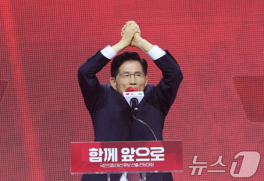 (고양=뉴스1) 이광호 기자 = 김문수 국민의힘 대통령 후보가 3일 오후 경기 고양시 킨텍스에서 열린 5차 전당대회에서 수락연설을 하고 있다. (공동취재) 2025.5.3/뉴스1skitsch@news1.krCopyright ⓒ 뉴스1. All rights reserved. 무단 전재 및 재배포, AI학습 이용 금지.