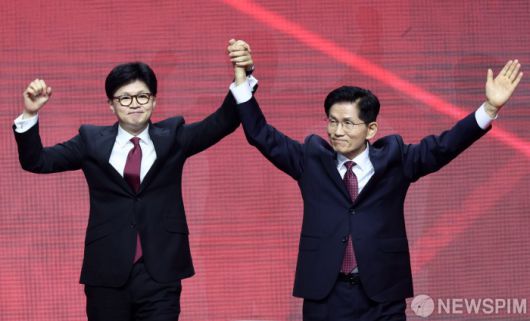 [고양=뉴스핌] 최지환 기자 = 국민의힘 대선후보로 선출된 김문수 후보가 3일 오후 경기 고양시 킨텍스에서 열린 국민의힘 제5차 전당대회에서 최종경선 경쟁 후보였던 한동훈 후보와 두 손을 잡고 인사하고 있다. 2025.05.03 choipix16@newspim.com |