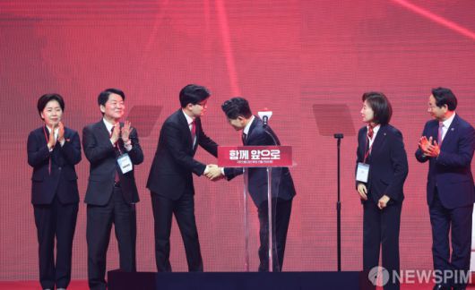 [고양=뉴스핌] 최지환 기자 = 국민의힘 대선후보로 선출된 김문수 후보가 3일 오후 경기 고양시 킨텍스에서 열린 국민의힘 제5차 전당대회에서 최종경선 경쟁 후보였던 한동훈 후보와 악수하고 있다. 2025.05.03 choipix16@newspim.com