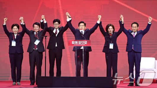 (고양=뉴스1) 이광호 기자 = 김문수 국민의힘 대통령 후보가 3일 오후 경기 고양시 킨텍스에서 열린 5차 전당대회에서 최종 후보로 확정된 뒤 기념 촬영하고 있다. 왼쪽부터 양향자, 안철수, 한동훈, 김문수, 나경원, 유정복. (공동취재) 2025.5.3/뉴스1
