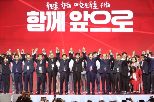 국민의힘 대선 후보로 선출된 김문수 후보가 3일 경기 고양시 킨텍스에서 열린 국민의힘 전당대회에서 한동훈 후보를 포함한 참석자들과 기념촬영을 하고 있다. 〈연합뉴스〉 박지호 기자 jihopress@etnews.com [Copyright © 전자신문. 무단전재-재배포금지]