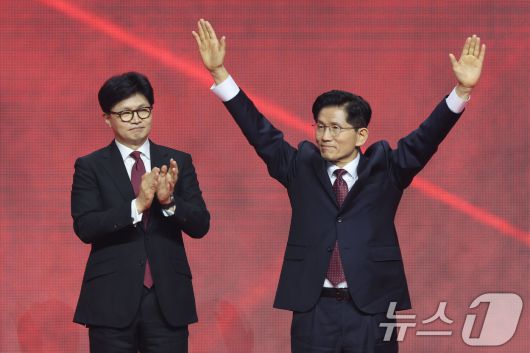 (고양=뉴스1) 이광호 기자 = 제21대 대통령선거 국민의힘 후보자로 선출된 김문수 후보가 3일 경기 고양시 킨텍스에서 열린 5차 전당대회에서 두 팔을 들어 인사하고 있다. 2025.5.3/뉴스1