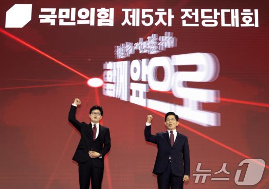 (고양=뉴스1) 김민지 기자 = 김문수(오른쪽), 한동훈 국민의힘 대선 경선 후보가 3일 오후 경기 고양시 킨텍스에서 열린 제5차 전당대회에 참석해 인사하고 있다. (공동취재) 2025.5.3/뉴스1