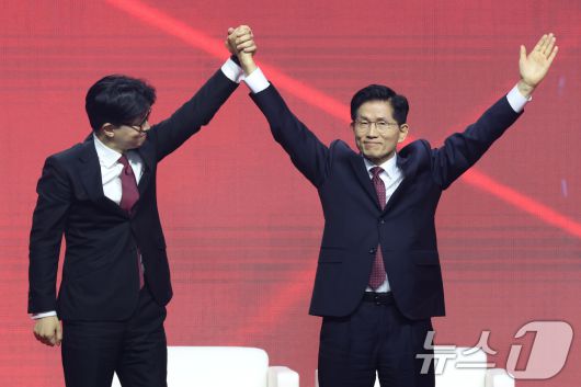 (고양=뉴스1) 이광호 기자 = 제21대 대통령선거 국민의힘 후보자로 선출된 김문수 후보가 3일 경기 고양시 킨텍스에서 열린 5차 전당대회에서 두 팔을 들어 인사하고 있다. 2025.5.3/뉴스1