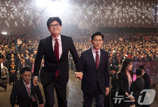 (고양=뉴스1) 김민지 기자 = 김문수(오른쪽), 한동훈 국민의힘 대선 경선 후보가 3일 오후 경기 고양시 킨텍스에서 열린 제5차 전당대회에 참석해 단상으로 향하고 있다. (공동취재) 2025.5.3/뉴스1