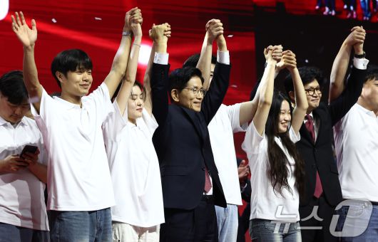 (고양=뉴스1) 김민지 기자 = 김문수 국민의힘 대통령 후보가 3일 경기 고양시 킨텍스에서 열린 5차 전당대회에서 최종 후보로 확정된 뒤 한동훈 후보와 함께 청년들과 손을 잡고 기념촬영을 하고 있다. 2025.5.3/뉴스1kimkim@news1.krCopyright ⓒ 뉴스1. All rights reserved. 무단 전재 및 재배포, AI학습 이용 금지.