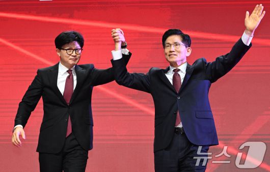 (고양=뉴스1) 김민지 기자 = 김문수 국민의힘 대통령 후보가 3일 경기 고양시 킨텍스에서 열린 5차 전당대회에서 최종 후보로 확정된 뒤 기뻐하고 있다. 왼쪽은 한동훈 대선 경선 후보. (공동취재) 2025.5.3/뉴스1kimkim@news1.krCopyright ⓒ 뉴스1. All rights reserved. 무단 전재 및 재배포, AI학습 이용 금지.
