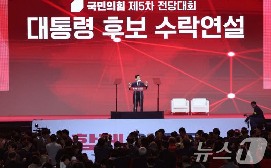 (고양=뉴스1) 이광호 기자 = 김문수 국민의힘 대통령 후보가 3일 경기 고양시 킨텍스에서 열린 5차 전당대회에서 최종 후보로 확정된 뒤 수락 연설을 하고 있다. (공동취재) 2025.5.3/뉴스1