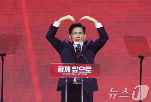 (고양=뉴스1) 이광호 기자 = 김문수 국민의힘 대통령 후보가 3일 경기 고양시 킨텍스에서 열린 5차 전당대회에서 최종 후보로 확정된 뒤 수락연설을 하고 있다. (공동취재) 2025.5.3/뉴스1skitsch@news1.krCopyright ⓒ 뉴스1. All rights reserved. 무단 전재 및 재배포, AI학습 이용 금지.